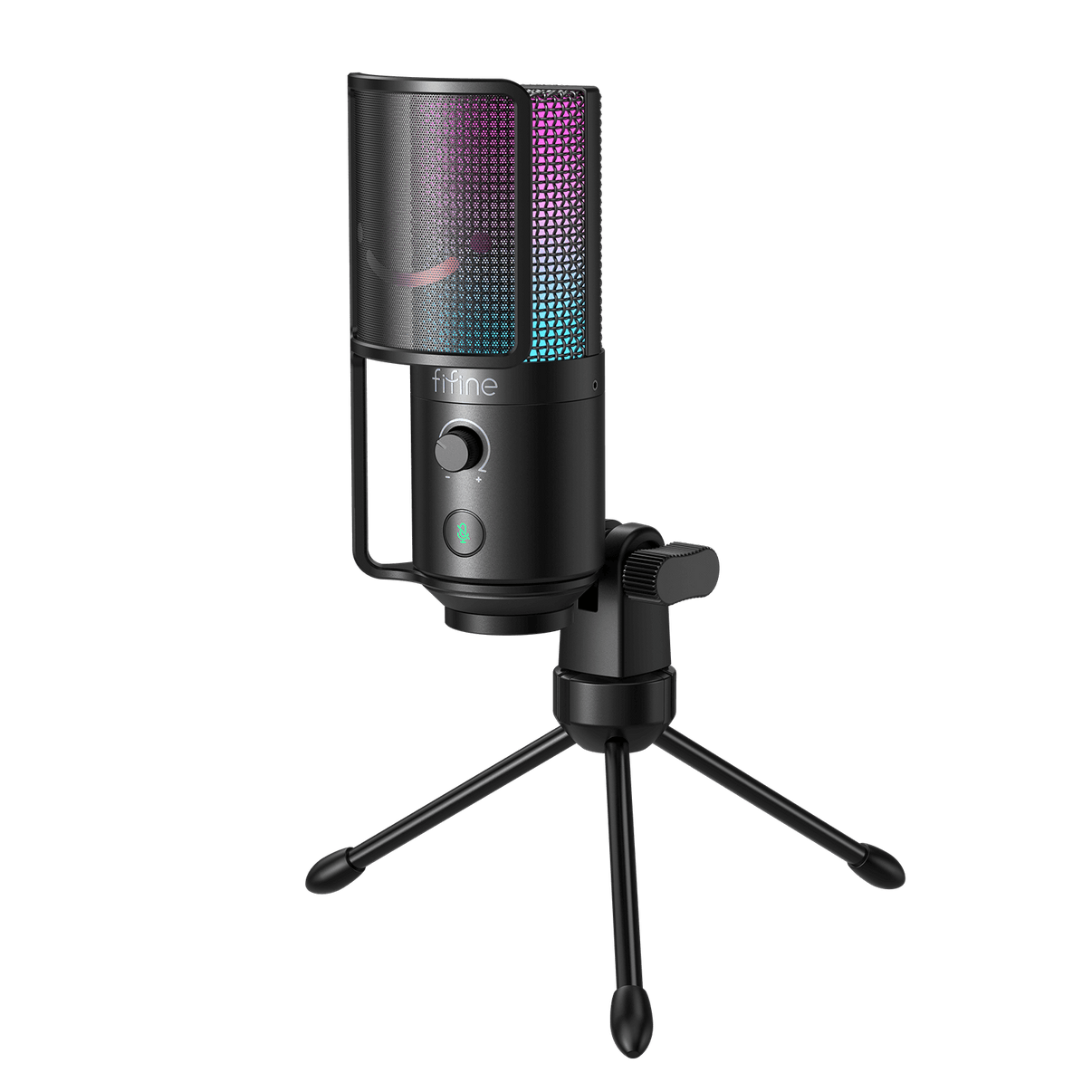 Record and stream like a pro with FIFINE K669Pro3 microphone: USB simplicity, touch-mute, input volume control, RGB lighting, plus included tripod and pop filter.